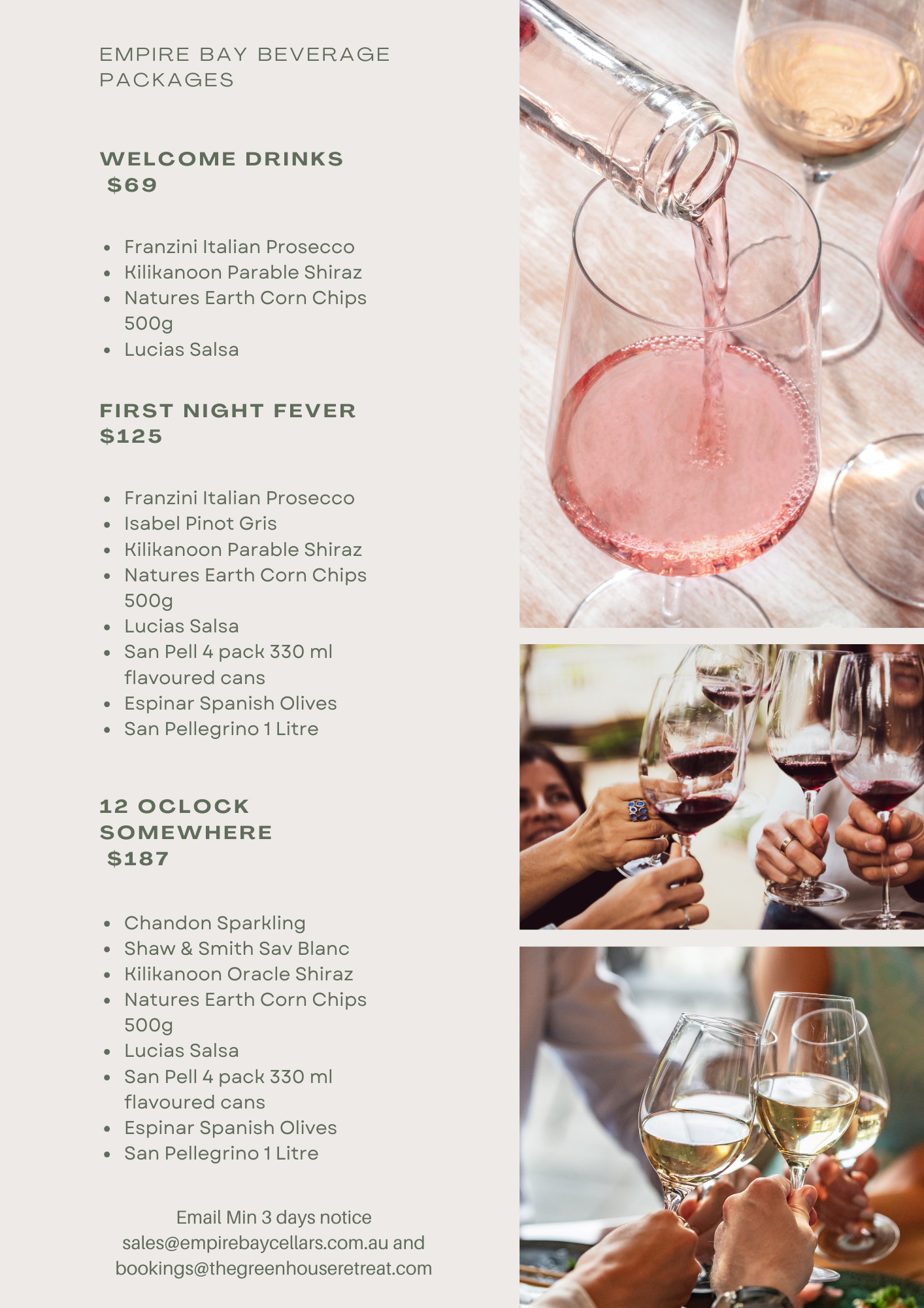 Pre order a beverage package from our local partner Empire Bay Cellars. Order before your stay and they will deliver it to the house ready for your arrival.
